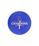 Made for the ultimate sports fan, you will be proud to show where your loyalty lies with this impressive Officially Licensed Texas Rangers 2023 World Series Champion stool from the Holland Bar Stool Co. This contemporary L8B2B stool has a single-ring black wrinkle base with a 2 1/2" thick cushion sitting on top of a 2" black wrinkle ring that conceals the swivel for an exceptionally clean look. A state of the art print process is used in applying specially formulated UV vinyl ink in numerous stages to produce a sharp, crisp, clear image to ensure a perfect reproduction of the logo. You won't find a higher quality logo stool on the market. The frame is made from commercial quality 16 gauge, 1 1/4 inch tube steel with solid mig welded joints to guarantee strength and durability. The powder coated finish resists chips and scratches and ensures a long-lasting, rich appearance. The cushion seats are of the highest quality as well, utilizing a breathable, commercial grade vinyl. At the heart of the cushion is highly-dense, US made foam that provides maximum support and will not breakdown in a couple years. If you're going to finish your bar, game room, or man cave do it right- with a logo stool made in the USA by the Holland Bar Stool Co.